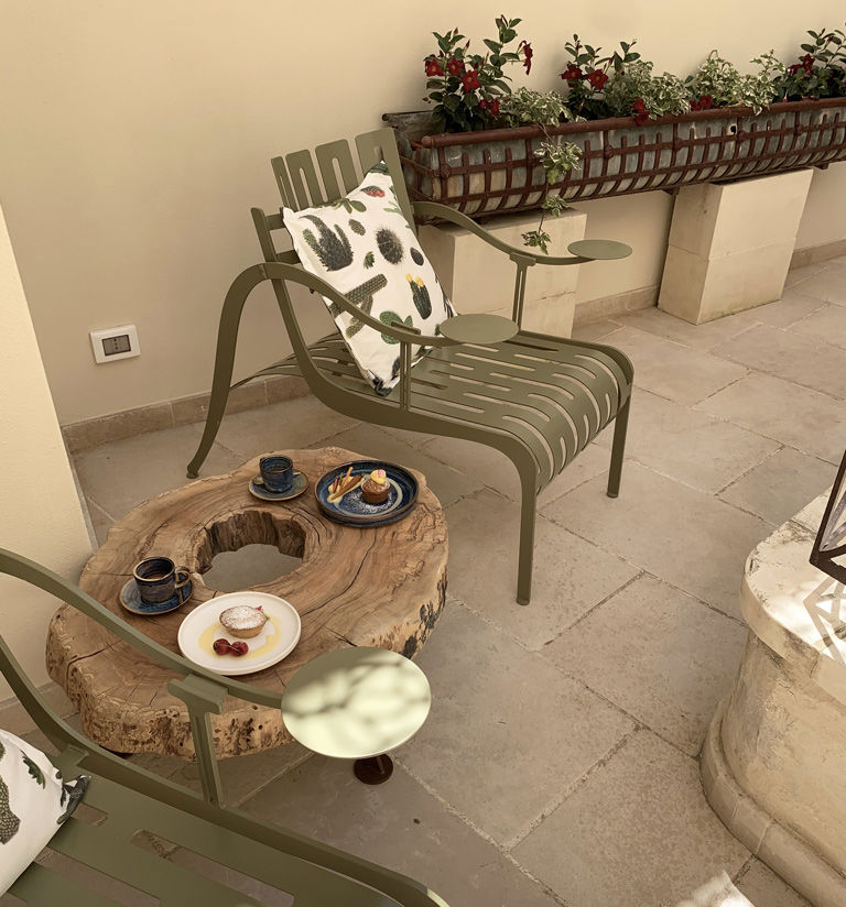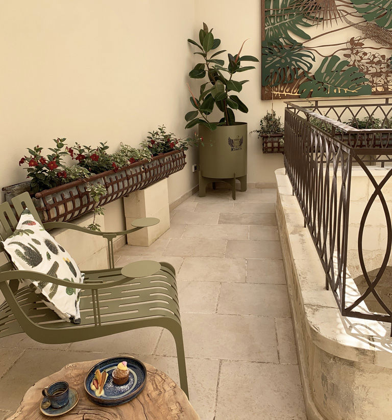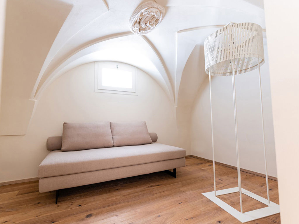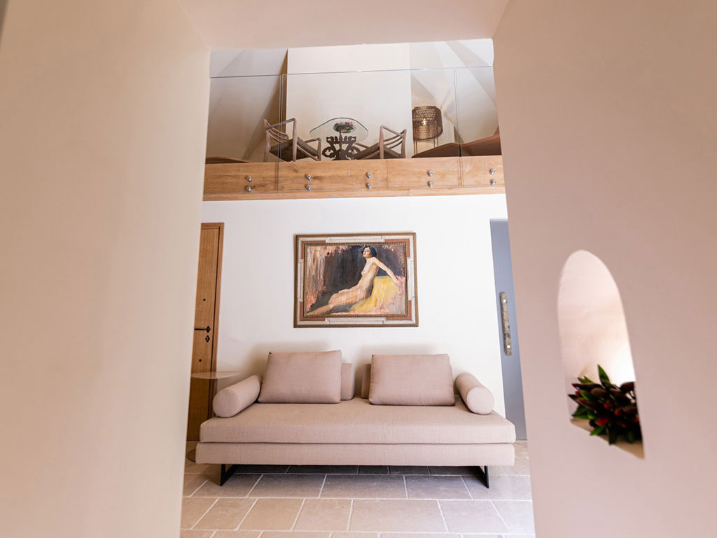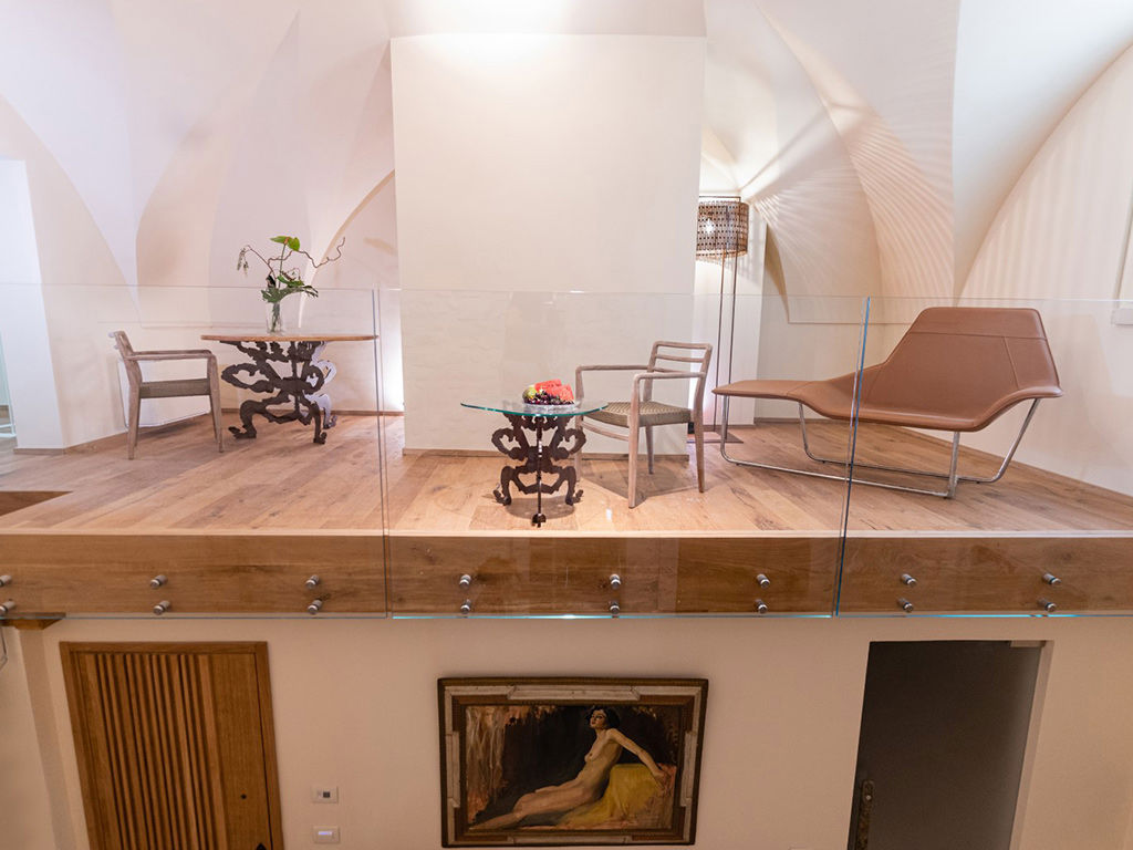 Then, on the mezzanine level, another room, smaller but refined with a bas-relief on the ceiling and a little window that, like a small nest, creates a quiet and intimate corner, sheltered from everything and everyone. In addition, the suite comes with an exclusive terrace, adorned with antique planters and cascading plants.