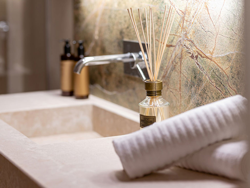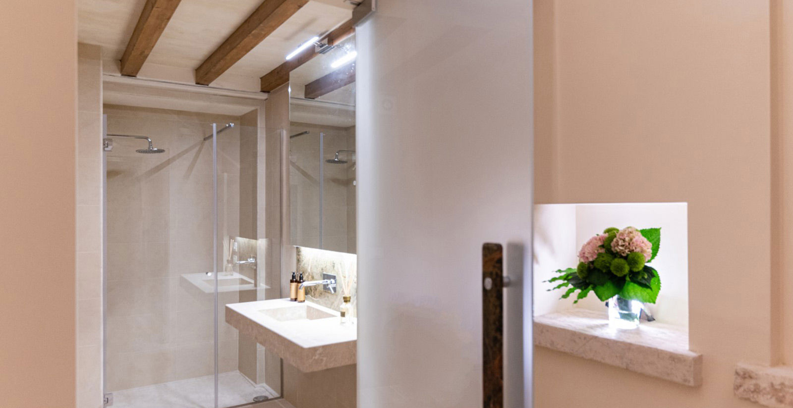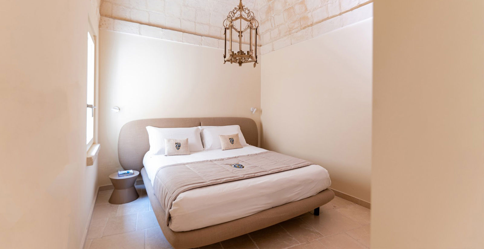 Then, on the mezzanine level, another room, smaller but refined with a bas-relief on the ceiling and a little window that, like a small nest, creates a quiet and intimate corner, sheltered from everything and everyone. In addition, the suite comes with an exclusive terrace, adorned with antique planters and cascading plants.