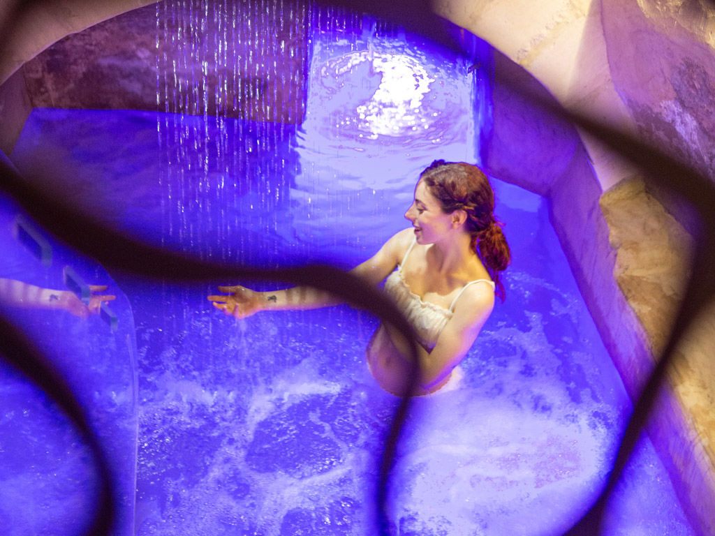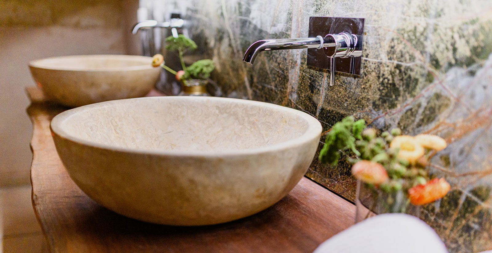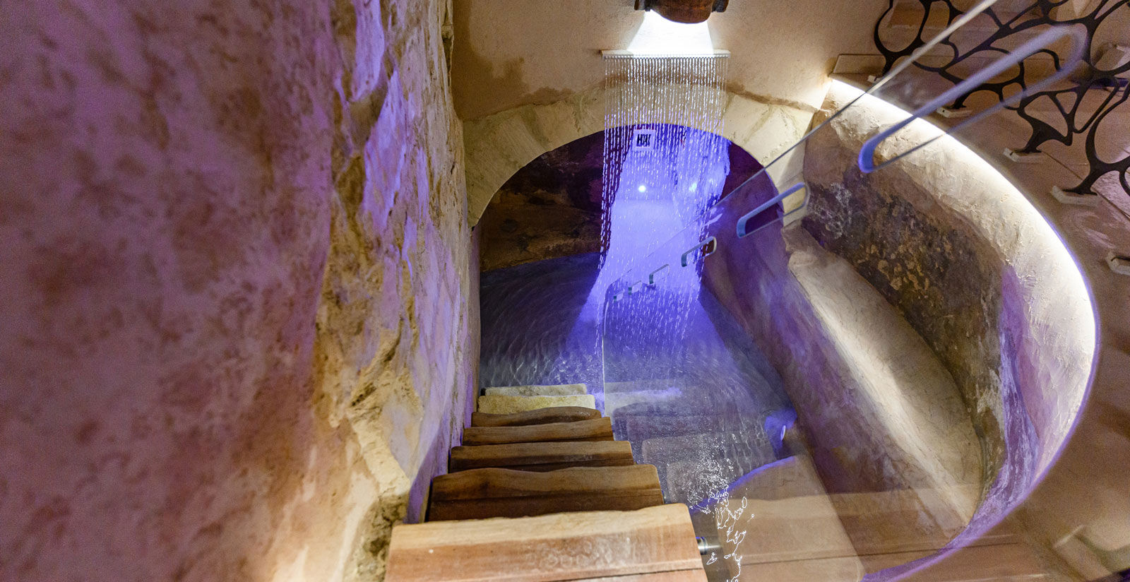 Going down the staircase, you reach a large bathroom, where a water cascade in an underground cave pool steals the show and promises a unique rejuvenating experience.