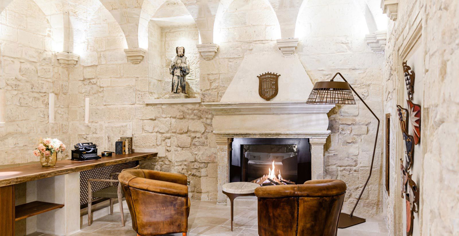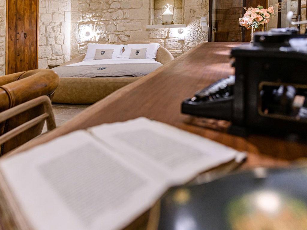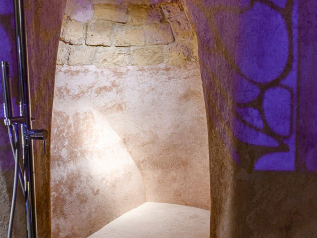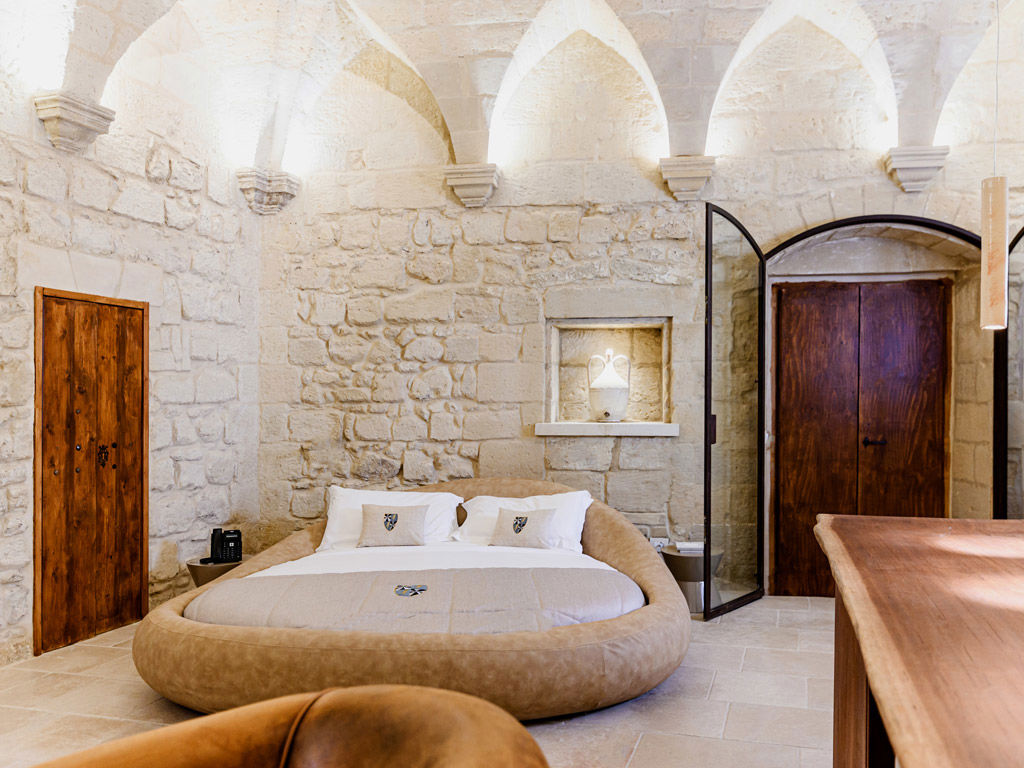 Under the typical 16th century “lunette” ceiling, which creates a magical play of lights and shadows, there is a wide modern bed, seemingly in contrast with the context, that creates a perfect harmony due to its roundness that follows the curves of the room. A large fireplace invites the guests to sink into the antique armchairs and relax.