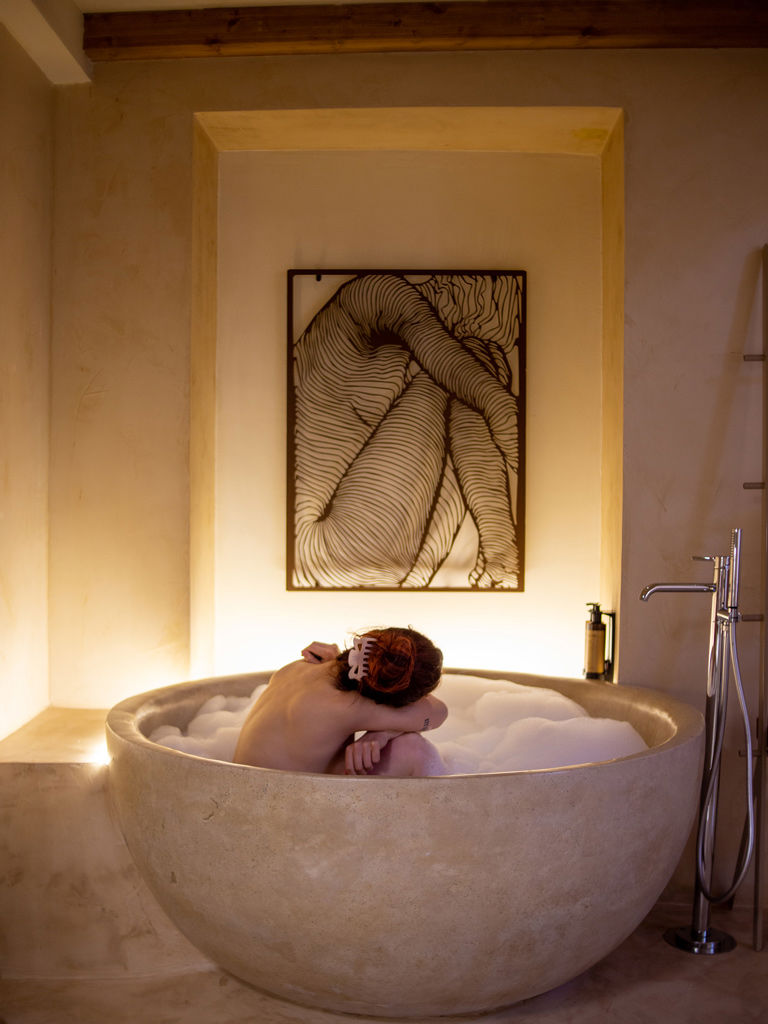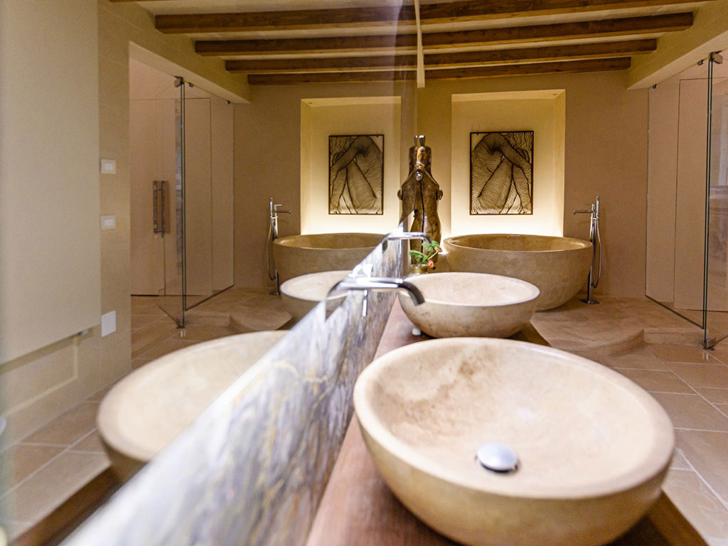 Par l’escalier on rejoint la mezzanine où le sofa se transforme en lit. La salle de bain riche en marbres de différentes couleurs vous permet de choisir entre la douche et la baignoire.