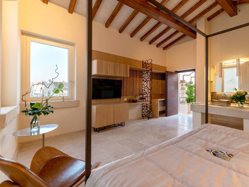 La stanza da letto è stata ricavata all'interno di una delle due antiche “suppinne” che, un tempo, erano i locali di servizio che fungevano da lavanderie dove si facevano i bucati settimanalmente.